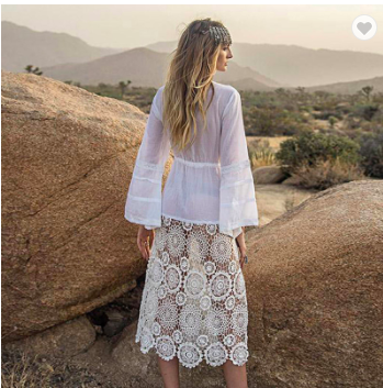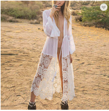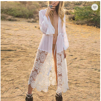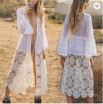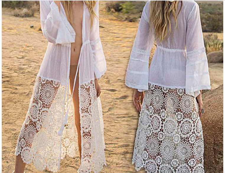 #105 Summer Beautiful White Lace Hem Bell Sleeve Pull String Long Cardigan Beach Cover Up
