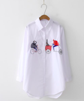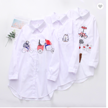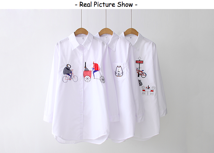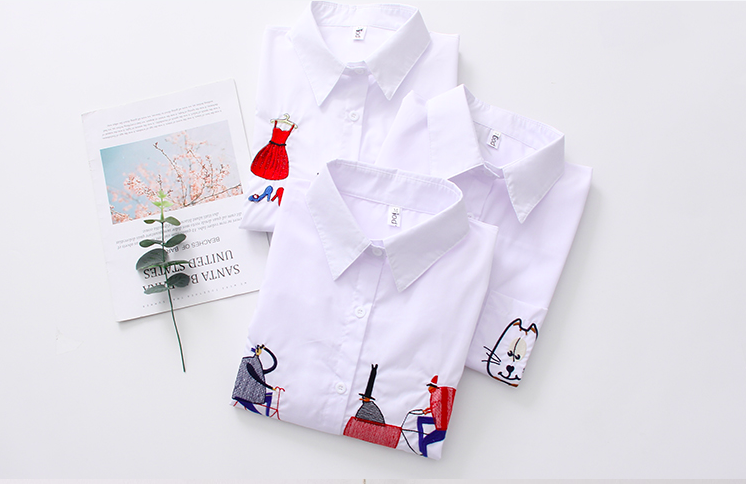 Blouses & Tops Clothing Length: Long Pattern Type: Cartoon Collar: Turn-down Collar Sleeve Length(cm): Full Decoration: Embroidery Material: Polyester/Cotton Fabric Type: Broadcloth Sleeve Style: Regular Top Type: Shirt / Blouse Technics: Embroidered Feature: Breathable, Plus Size, QUICK DRY, Washable Season: Spring Style: Casual, Casual Wear Product Name: Women Embroidery Shirts Type: Blouses/Shirts Sleeve: Long Sleeve Color: White Size: S-XL Place Of Origin: China Pattern: Cartoon Fabric: 90%Cotton+10%Polyester
