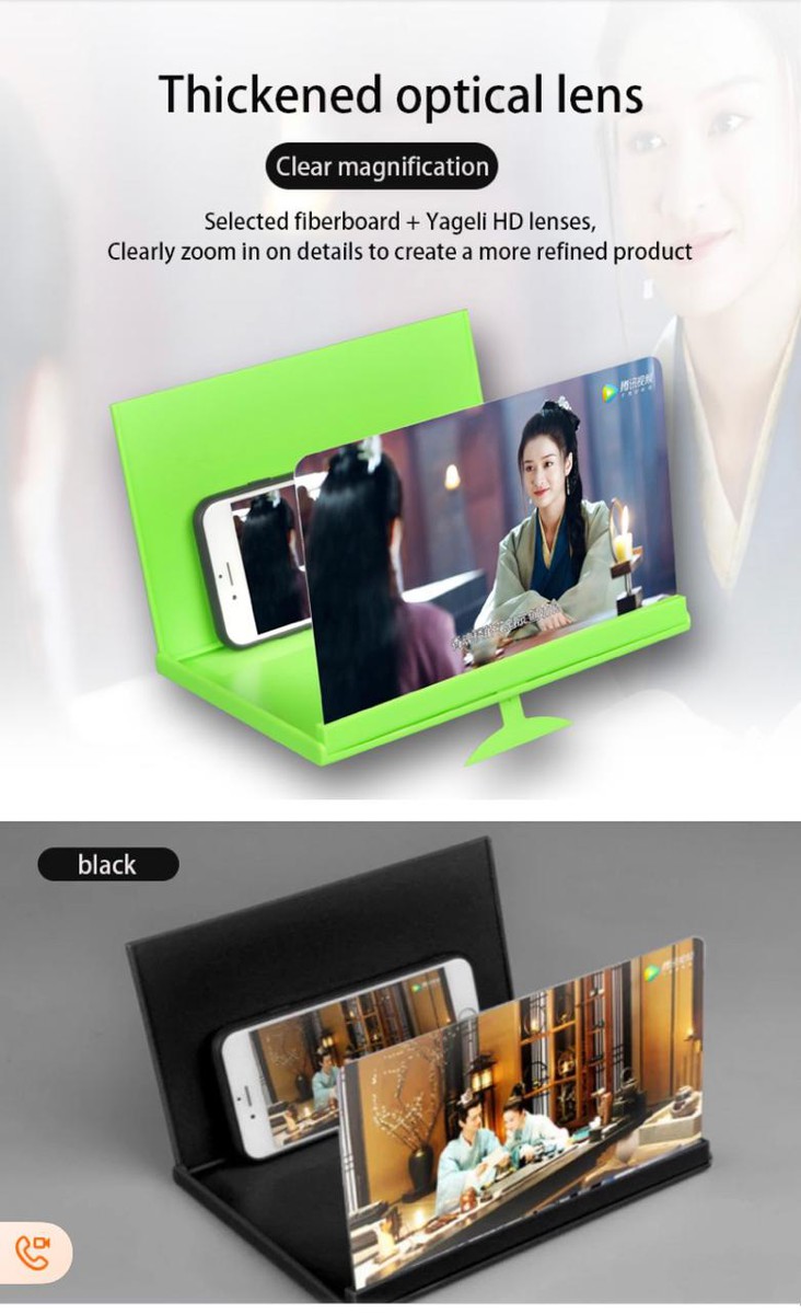 Feature: 3D Video Display Foldable Universal Screen Magnifier HD Expander Reduce eye fatigue of movies and television brought on mobile phone, and stinging eyes and tears phenomenon Fully enclosed design, the full range of lock light source to improve the screen brightness, effective to prevent the reflection of the screen. New upgrade HD lens, the picture is more clear. The French Fresnel High-definition Optical Technology can be zoom in three times in the mobile phone, picture clear lifelike, dynamic feel more strong Product modelling concise and easy, light weight, small size, easy to carry, suitable for various occasions used in indoor, camping, travel, leisure Specification: Color:Black,White,blue,green Texture: abs Net Weight: 180g Packing list: 1 x cell phone screen magnifier