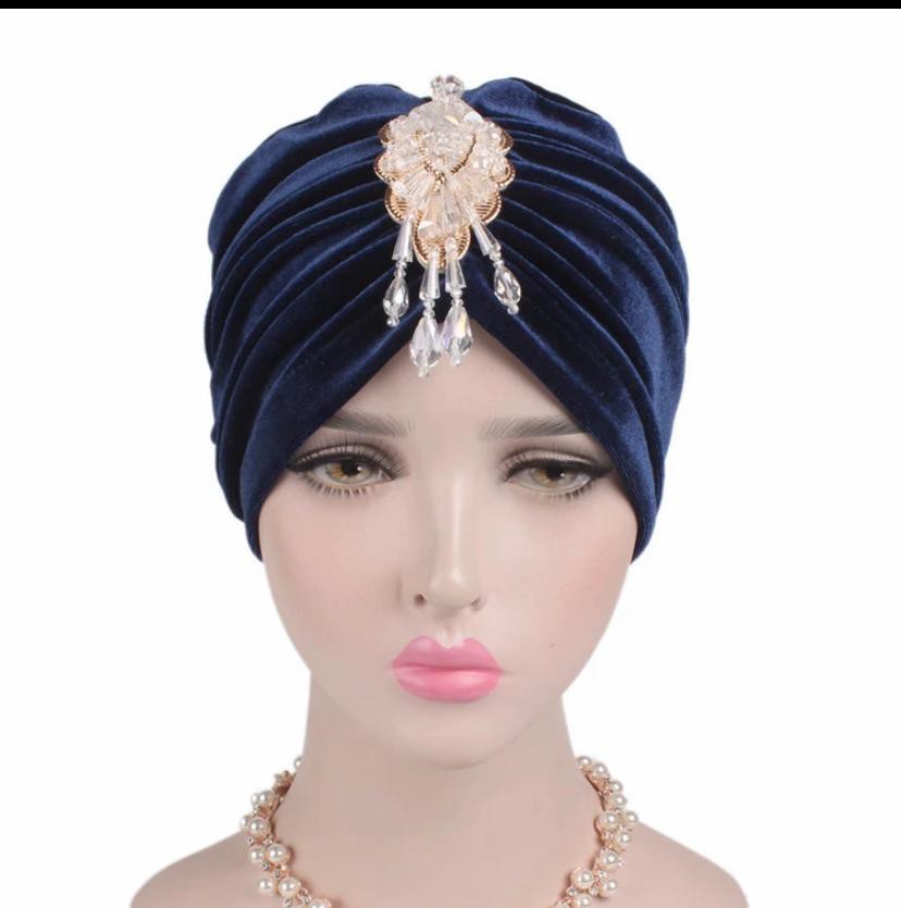 Velvet turban with gold broach in navy and emerald green