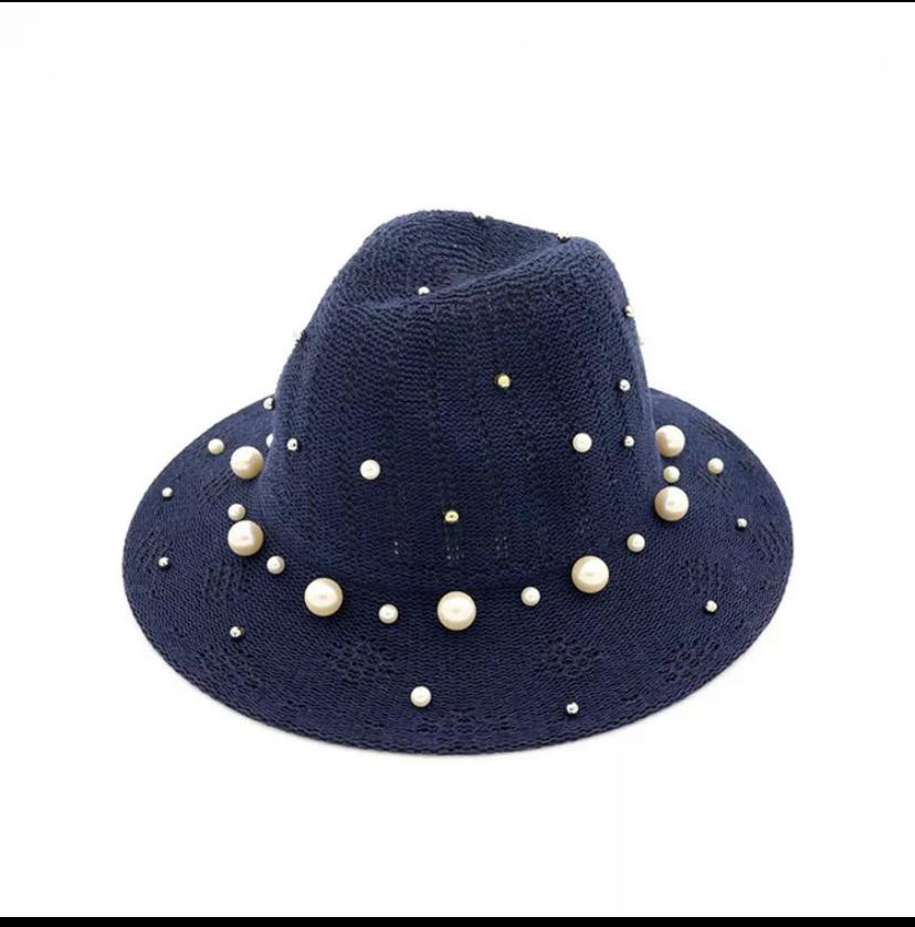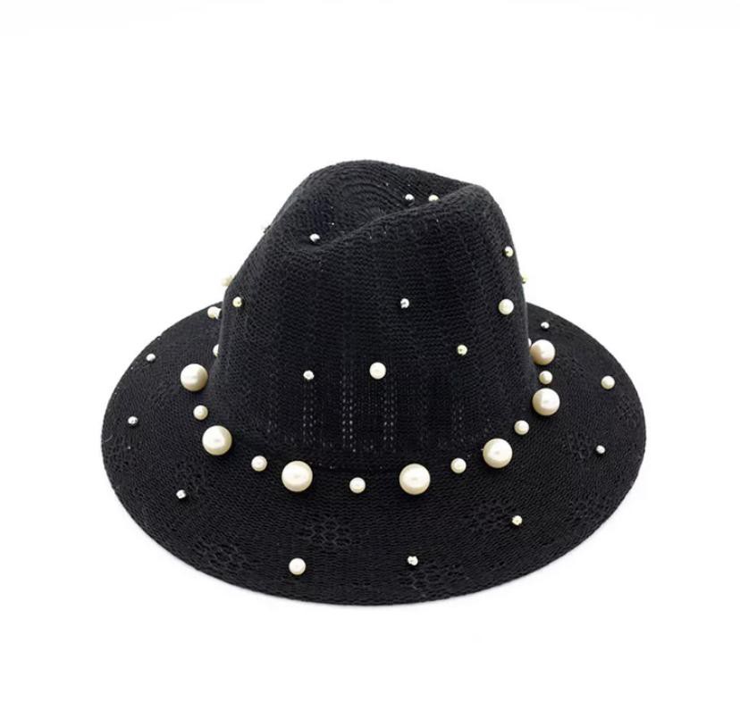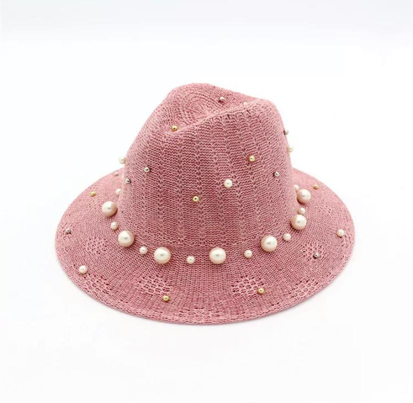 X1352 Lady Panama Sun Hats Pearl Decorate Big Brim Sun Hats Sun Protection Promotional Summer Beach Paper Straw Hat with Ribbon