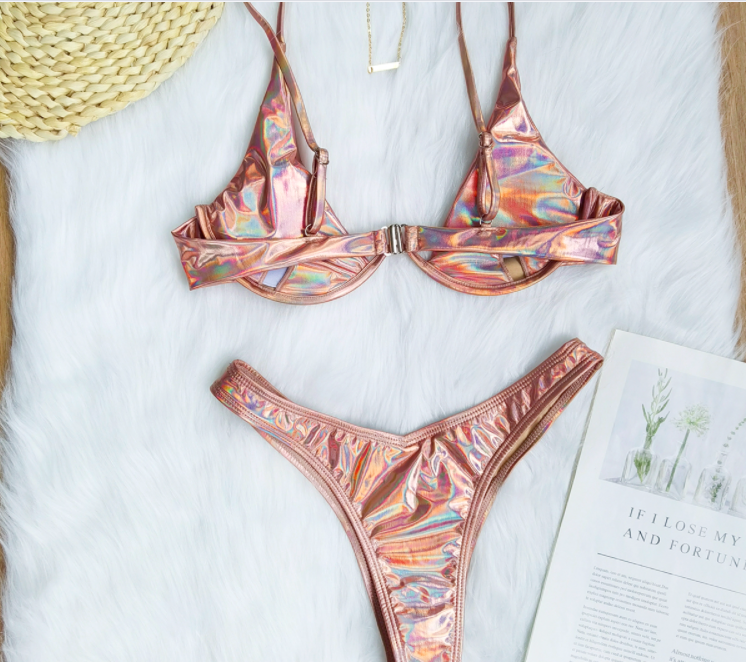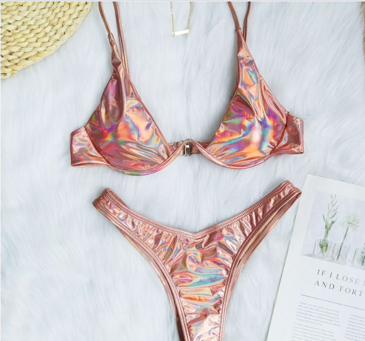 Feature: Breathable, QUICK DRY, Anti-UV, Nontoxic Supply Type: Material: polyester+spandex Gender: Women Style: Bikini, triangle, Underwire, Crop-Top, shiny, low waist, thong Pattern Type: Solid Not SupportProduct name: wholesale sexy brazilian thong bikinis swimwear micro bikini Color: champagne color, purple, blue, rose red Fabric: polyester+spandex Size: S-M-L