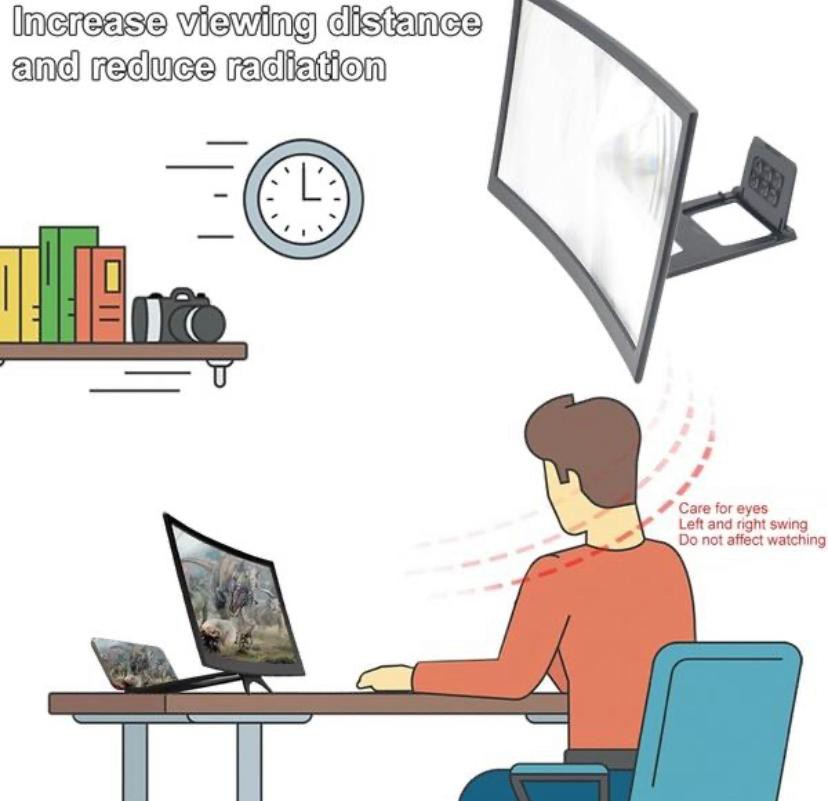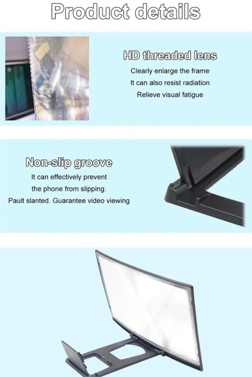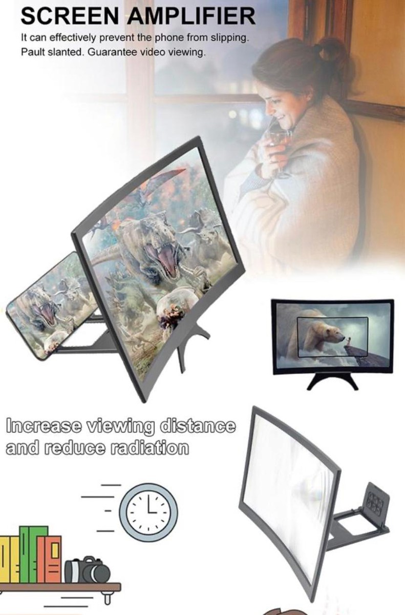 Feature 1HD Screen: New curved phone HD screen amplifier, large field of view HD zoom screen reduces radiation. 2Zoom in 3-4 Times: 1:1 clear original picture is enlarged 34 times. The second became a "private screen theater" immersive. 3Protect the Cervical Spine: Free your hands. Adjust the viewing angle and care for the health of the cervical spine. 4Prevent Slipping: It can effectively prevent the phone from slipping. Pault slanted. Guarantee video viewing. 5Strong Pressure Resistance: Good resistance to pressure and toughness is a curved screen design. But it has a strong ability to withstand pressure. Good physical properties. That is, use force to flatten it. But let go of the back fork and restore the curved screen as it is. Specifications: Screen size: about 12in Product size: about 25*16*2cm/9.84*6.3*0.79in Material: Acrylic lens + ABS housing Applicable models: general Available colors: black Package Included: 1* Amplifier 1* Bracket 1* Instruction