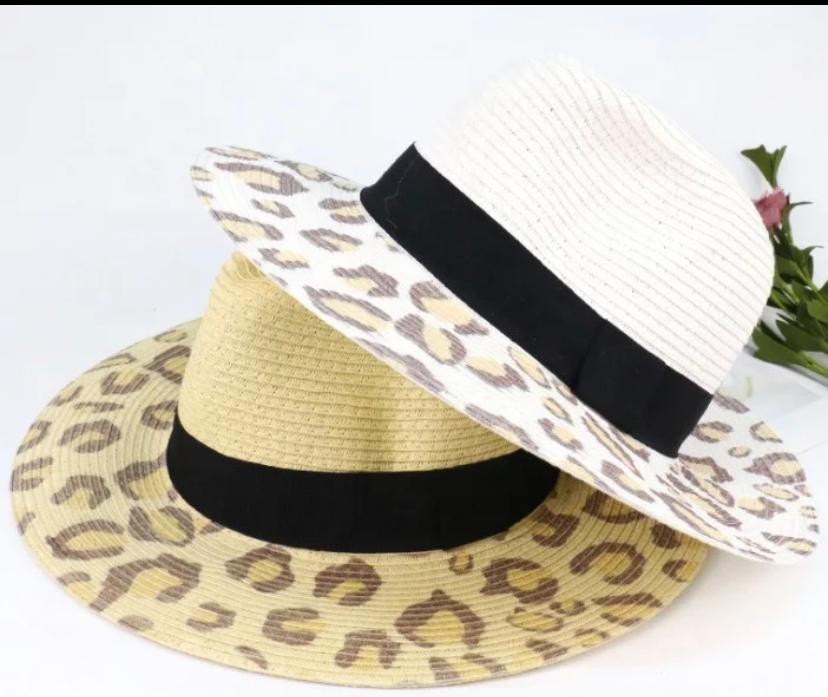 Women Girls Cute Straw Wide Brim Hats with Leopard Printed on Brim