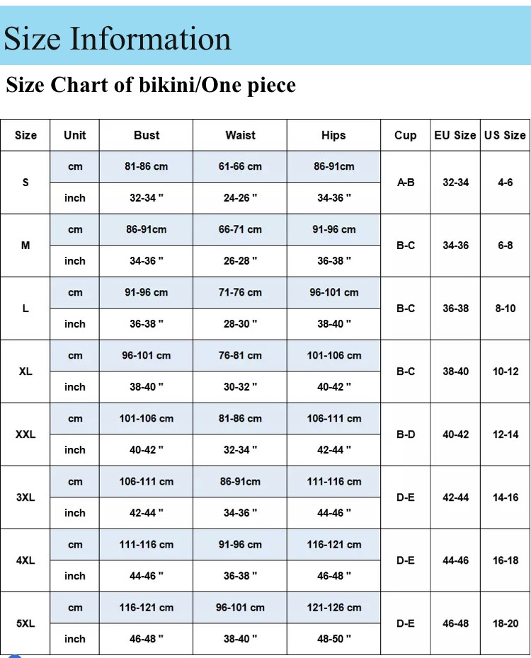Tips: * Bust This is not your bra size. Wear an unpadded bra (your dress will have a built-in bra). Relax arm at sides, pull tape across the fullest part of the bust. * Waist Find the natural waist, this is the smallest part of the waist. Usually about 1 inch above belly button, keep tape slightly loose to allow for breathing room. * Hips Find the widest part of the hips. Usually about 7 inch below natural waist, tape should brush across both hipbones. How to care and wash your beautiful swimsuits? 1. Wet it with clean water before swimming to reduce the corrosion of the swimsuit by pool water or seawater. 2. Use sunscreen first and then wear your swimsuit to prevent sunscreen from getting on the swimsuit and corrosive to it. 3. After swimming, wash the bathing suit with clean water immediatly. Do not use hot water, washing powder, bleach or washing machine to wash it. 4. After cleaning the swimwear, do not expose it to sunlight, try to put it in a ventilated and cool place to dry.