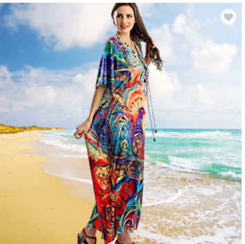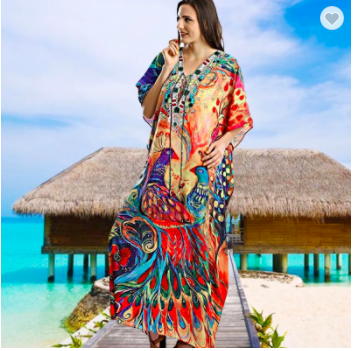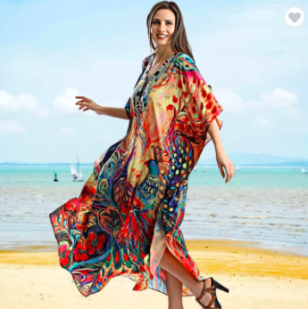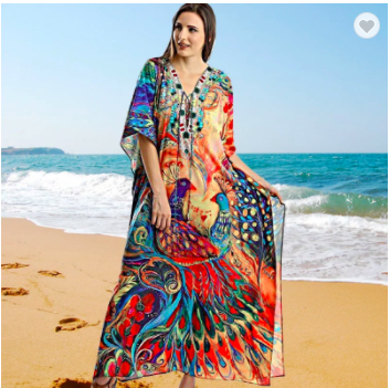 #1347 Beautiful Peacock Print Quick Dry Kaftan Gown Maxi Dress Beach Cover Up