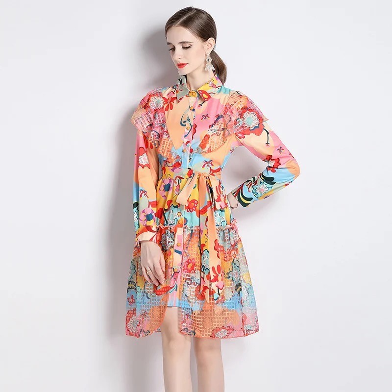 Yendi lace printed collar shirt midi dress Anti-wrinkle, Washable, Breathable