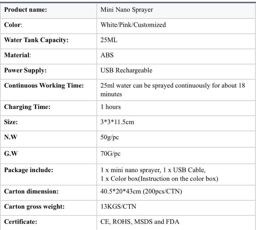 Package includes:? 1 x mini nano sprayer,? 1 x USB Cable, ?1 x Color box( Instruction on the color box)