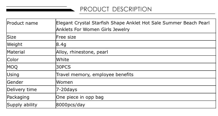 Elegant Crystal Starfish Shape Anklet Hot Sale Summer Beach Pearl Anklets For Women Girls