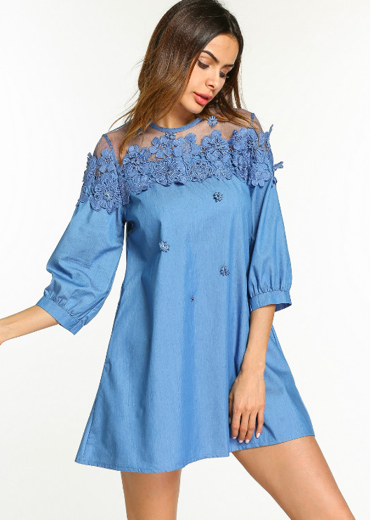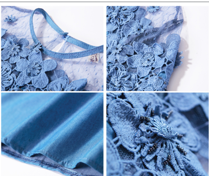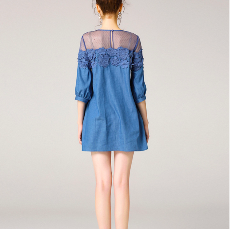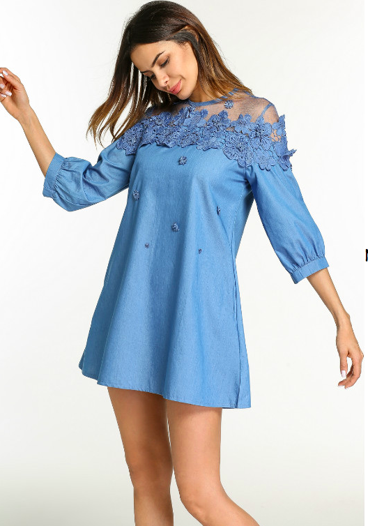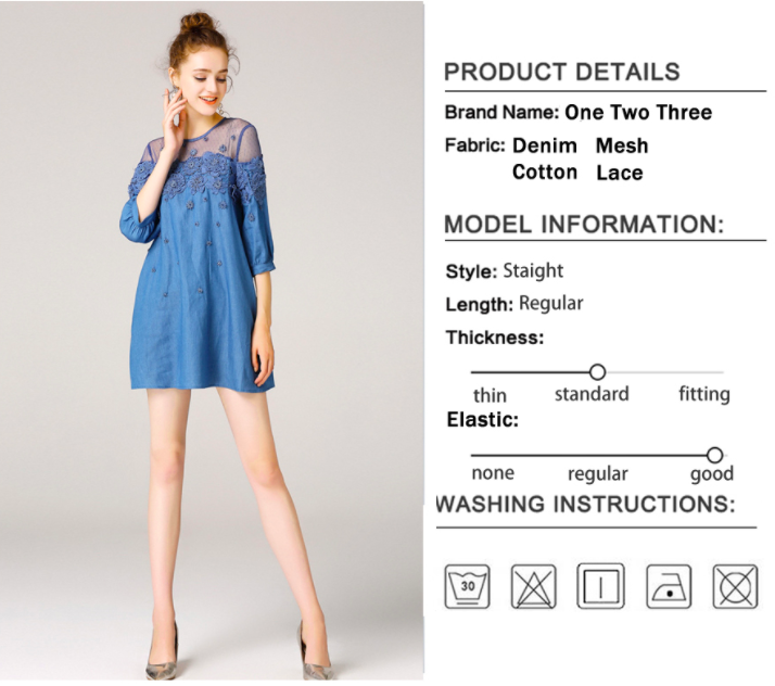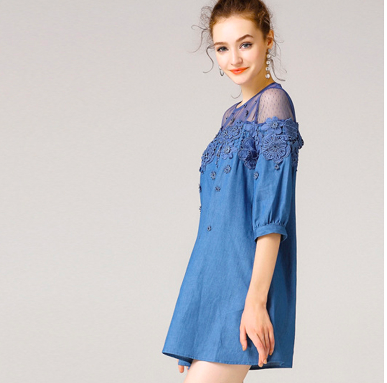 Patchwork Waistline: Natural Neckline: O-Neck Dresses Length: Mini, Above Knee, Mini Style: Casual, Casual Silhouette: A-Line Season: Summer Sleeve Length(cm): Half Decoration: Lace Supply Type: In-Stock Items Material: Cotton/Polyester Fabric Type: Denim Technics: Beaded Feature: Anti-wrinkle, Breathable, Plus Size, Washable Sleeve Style: Short sleeve Product Type: Women Jeans Dresses Suitable Season: Summer Sleeve: Half Sleeve Fabric: Denim/Lace Color: Light Blue