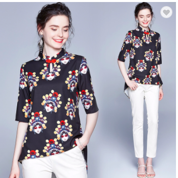 #1918 Vintage printing irregular stand collar short sleeve black top blouse$100.00