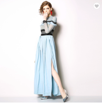 #9702 Long Sleeve Hollow Out Lace Patchwork Pleated Fashion Celebrity Light Blue Slit Long Party Evening Dresses$300.00